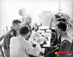 Hôm ấy danh nghĩa là tàu mời cơm Bác nhưng cũng chỉ có món thịt gà luộc, lòng gà xào miến và nước luộc gà nấu miến làm canh. Còn bàn ăn thì kê ngay ở mạn phải đuôi tàu. Bác ngồi ở phía ngoài, sát với cọc lan can. Nhìn Bác vui vẻ ăn, chúng tôi mới đỡ lo. Lúc đang ăn, Bác gọi xuống bếp: Thức ăn của ta đã nấu xong chưa hả chú? Đồng chí phục vụ trả lời: Thưa Bác xong rồi ạ! Mang lên đây góp cùng ăn với Hải quân. Đồng chí phục vụ Bác bê lên một đĩa bốn con cá rô phi rán. Nhìn đĩa cá, Bác bảo: ở giữa biển, Bác mời các chú ăn cá.